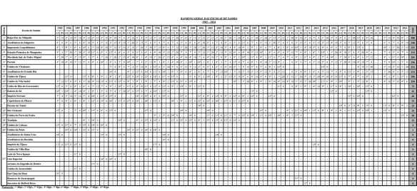 31 schools have paraded in the Grupo Especial since 1985, when LIESA was formed, the top ten most successful samba schools since then have been: